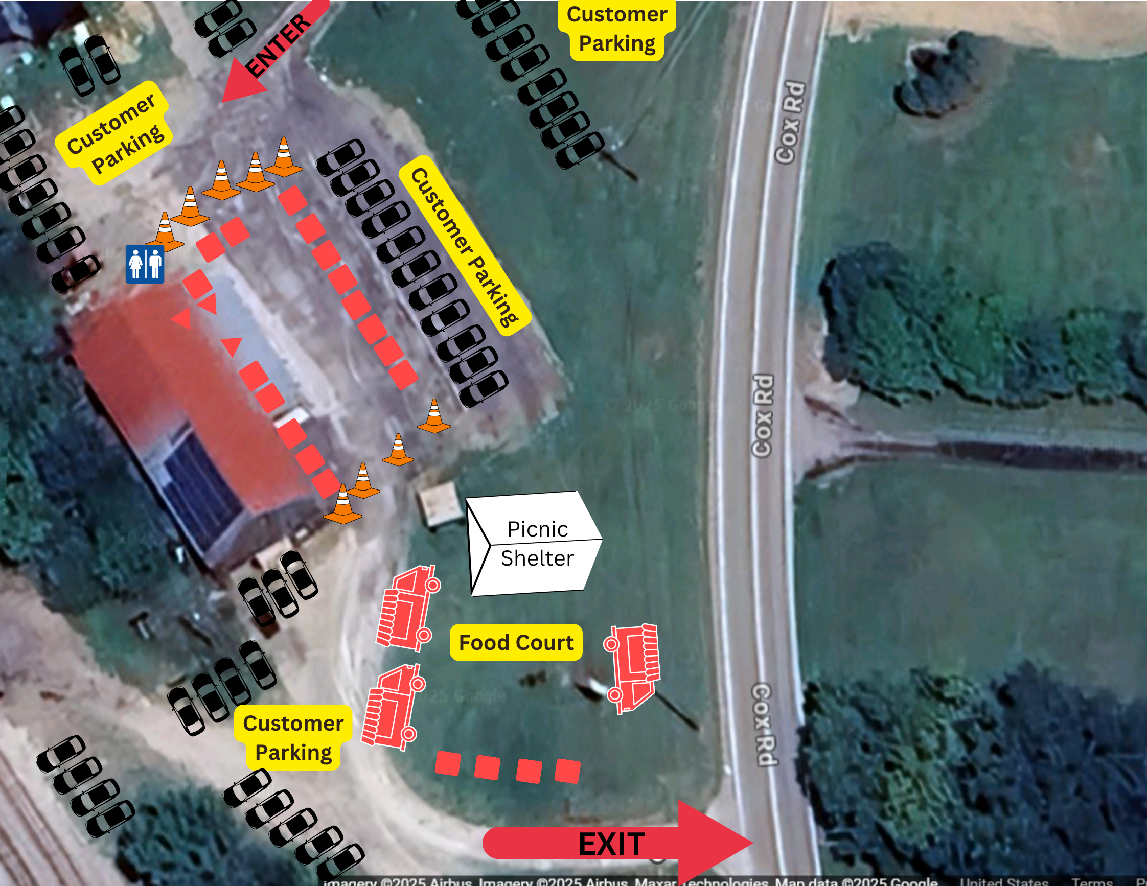Answer: The market manager will be on-site and will show you where to set up. In ideal circumstances you will have a paint stick with your name on it where your booth space is. You can drive right up to your booth space inside the market footprint, unload and then park your car as directed. Here is a rough layout of the site: