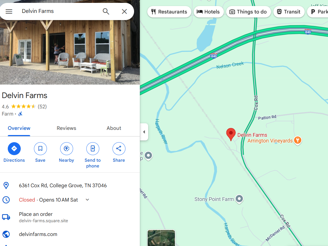 Answer: Delvin Farm Store @ 6361 Cox Road, Arrington, TN. We are directly across from the Arrington Vineyards. When using GPS, you may notice that it takes you to the wrong place. Please check the map location before hitting start on your GPS so that you end up in the right spot! See image below:
